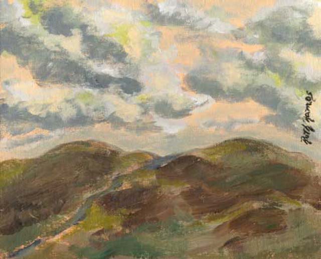 "Interstate 15," 8x10, acrylic on canvasboard © Ruth Ramos The southern Californian mountains make great companions on those long road trips.